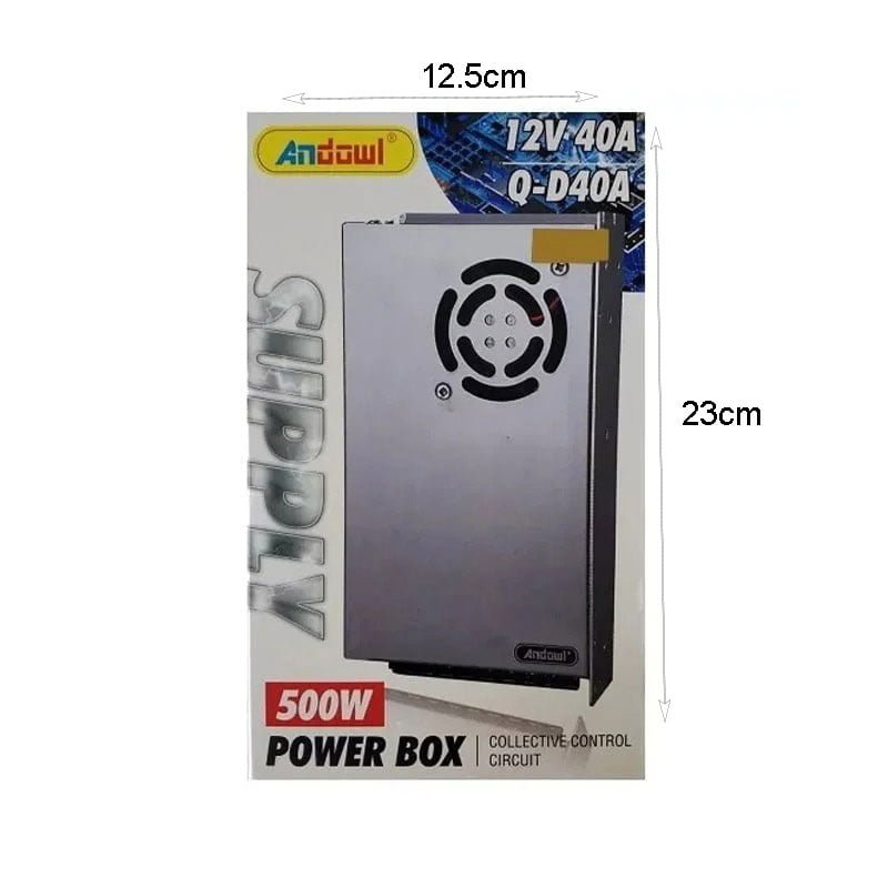 Τροφοδοτικό LED της Andowl με τάση εξόδου 12V DC. Η κατάλληλη ισχύς τροφοδοσίας για μια ταινία LED υπολογίζεται πολλαπλασιάζοντας την κατανάλωση της σε Watt ανά μέτρο με το μήκος της. Προτείνεται όμως να προμηθευτείτε τροφοδοτικό το οποίο να υποστηρίζει 20% επιπλέον της απαιτούμενης ενέργειας, προκειμένου να μη δουλεύει στα όριά του. Σε αυτή την περίπτωση η ισχύς τροφοδοσίας του προϊόντος είναι 500 Watt, το οποίο σημαίνει πως έχει τη δυνατότητα να τροφοδοτήσει, για παράδειγμα, μια ταινία LED 5 μέτρων με κατανάλωση ισχύος 48 Watt ανά μέτρο.