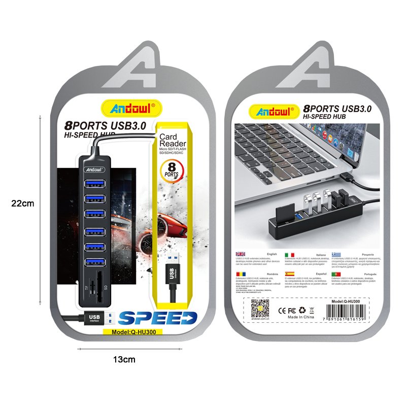 Το USB hub της εταιρείας Andowl διαθέτει 8 θύρες εξόδου USB 3.0, κατάλληλες για να συνδέσετε ταυτόχρονα στον υπολογιστή, συσκευές όπως ποντίκια, στικάκια, εξωτερικούς σκληρούς δίσκους, πληκτρολόγια και πολλά άλλα. Τροφοδοτείται μέσω του καλωδίου USB που συνδέεται στον υπολογιστή σας.