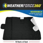 Το Weatherforce 360 ​​έχει διαστάσεις 6 πόδια επί 10 πόδια, ώστε να μπορεί να καλύψει το παρμπρίζ σχεδόν οποιουδήποτε μεγέθους αυτοκινήτου, από μικρότερου μεγέθους subcompact έως μεγαλύτερα, φαρδύτερα φορτηγά ή SUV.