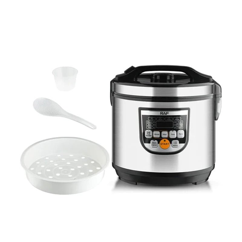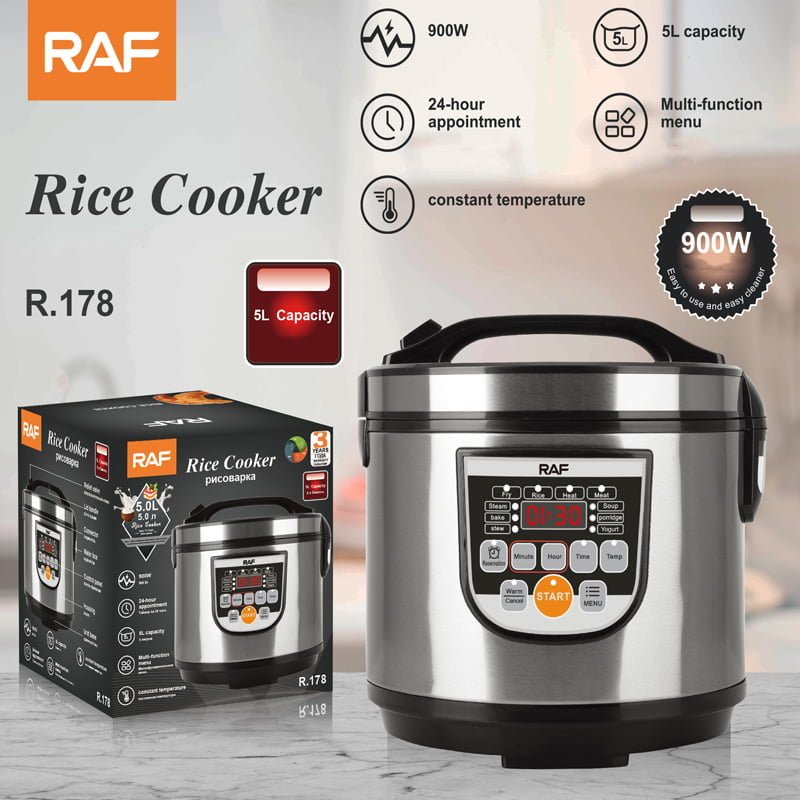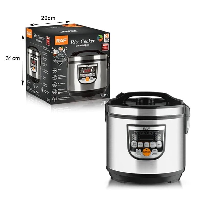 Η κουζίνα ρυζιού RAF R178 είναι ένας εύκολος τρόπος μαγειρέματος ρυζιού. Με ένα μεγάλο μπολ χωρητικότητας 5 λίτρων, αρκετό χώρο για να μαγειρέψετε έως και 25 φλιτζάνια ρύζι, είναι χρήσιμο για μεγαλύτερα νοικοκυριά που αγαπούν να μαγειρεύουν. Η λειτουργία Keep Warm σας επιτρέπει να διατηρείτε το ρύζι σας ζεστό, ιδανικό για εκείνες τις πολυάσχολες οικογένειες που δυσκολεύονται να κάτσουν όλοι μαζί. Η κουζίνα και ο ατμομάγειρας ρυζιού περιλαμβάνει μια σπάτουλα και ένα μεζούρα μαζί με έναν επιπλέον δίσκο για ψάρια ή λαχανικά στον ατμό που κάνουν το κομμάτι πολύ ευέλικτο. Εύκολο στο καθάρισμα και το γυάλινο καπάκι σας επιτρέπει να βλέπετε το φαγητό σας ενώ μαγειρεύετε και το αντικολλητικό αφαιρούμενο μπολ του επιτρέπει τον εύκολο καθαρισμό.