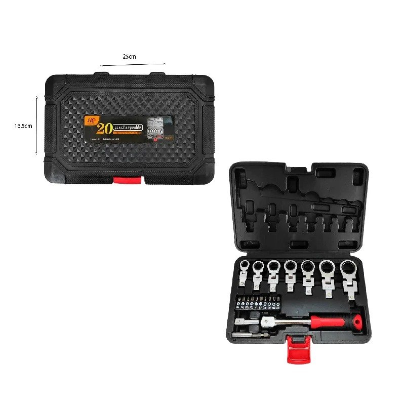Αυτό το σετ ξεχωρίζει καθώς έχει ακριβή σχεδιασμό, απλή λειτουργία και είναι πολύ βολικό στη χρήση σε μικρούς χώρους. Είναι κατασκευασμένο από υψηλής ποιότητας ατσάλι χρώμιο βαναδίου, επιχρωμιωμένο στην επιφάνεια, με υψηλή σκληρότητα, υψηλή ροπή και καλή σκληρότητα. Είναι βολικό να χρησιμοποιείτε το κλειδί για να επιτύχετε περιστροφή προς τα εμπρός σε διάφορες χωρικές γωνίες και να συνειδητοποιήσετε τη χρήση θετικής και αρνητικής αναστροφής. Έχει πολύ εύκολη χρήση και λειτουργία. Πατήστε το κουμπί και μπορείτε να αλλάξετε τις προδιαγραφές του κλειδιού που χρειάζεστε.