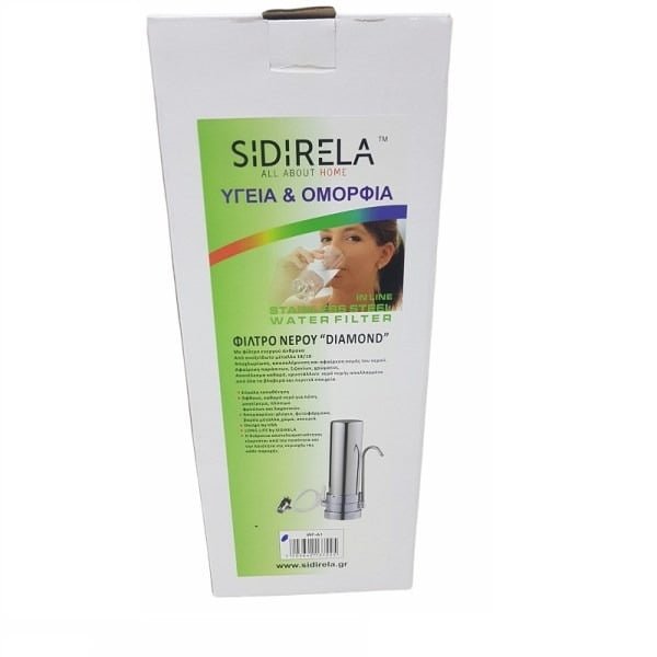 Συσκευή φιλτραρίσματος νερού σε ανοξείδωτο μεταλλικό περίβλημα, προσαρμόζεται στη βρύση με ανταλλακτικό φίλτρο ενεργού άνθρακα για κάθε τύπο βρύσης, εξαιρετικής ποιότητας.